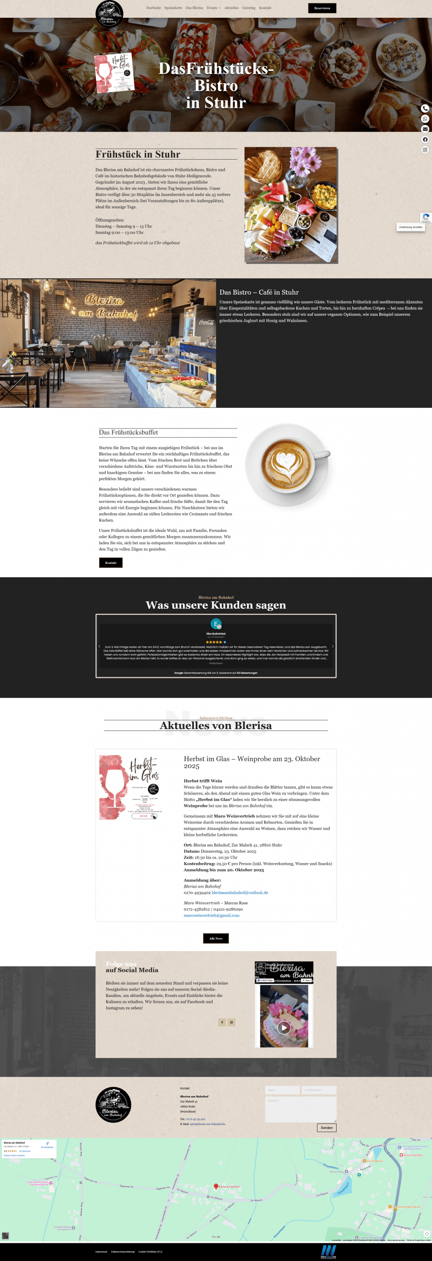 Die Herausforderung: Blerisa ist weit mehr als nur ein Bistro. Es ist ein Ort der Begegnung mit ländlichem Charme (Hühnerhof!), historischem Flair (Eisenbahnhalt) und vielseitigem kulinarischem Angebot (Frühstücksbuffet, Events, Catering). Die Website musste all diese Elemente vereinen und die besondere, gemütliche Atmosphäre digital einfangen.