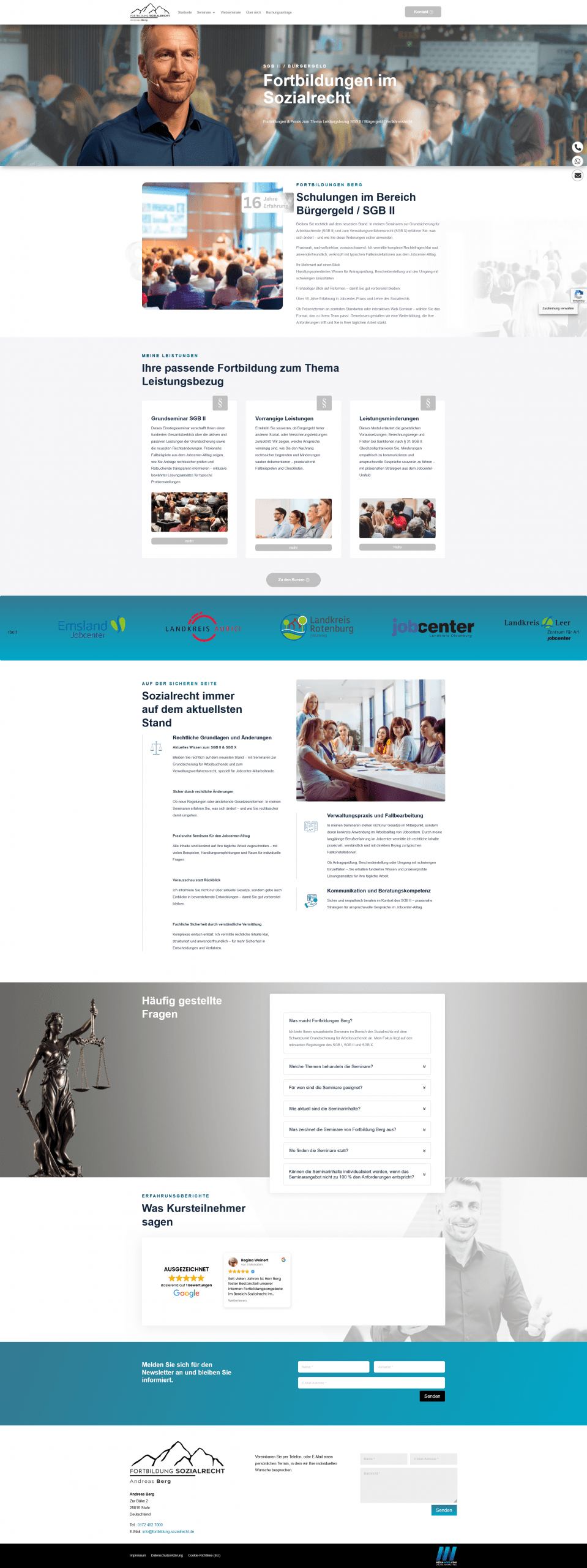 Die Herausforderung: Im komplexen und sich ständig ändernden Sozialgesetzbuch (insbesondere SGB II/Bürgergeld) benötigen Jobcenter-Mitarbeitende und verwandte Fachkräfte jederzeit aktuelles, handlungsorientiertes Wissen. Die Webseite musste diese Spezialisierung klar kommunizieren und die über 16 Jahre Praxiserfahrung des Dozenten glaubwürdig vermitteln.